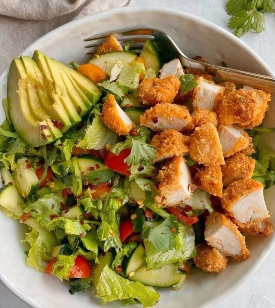 A satisfying, flavor-packed salad that brings together golden crispy chicken, creamy avocado, and fresh vegetables—perfect for a hearty lunch, light dinner, or a standout recipe post.