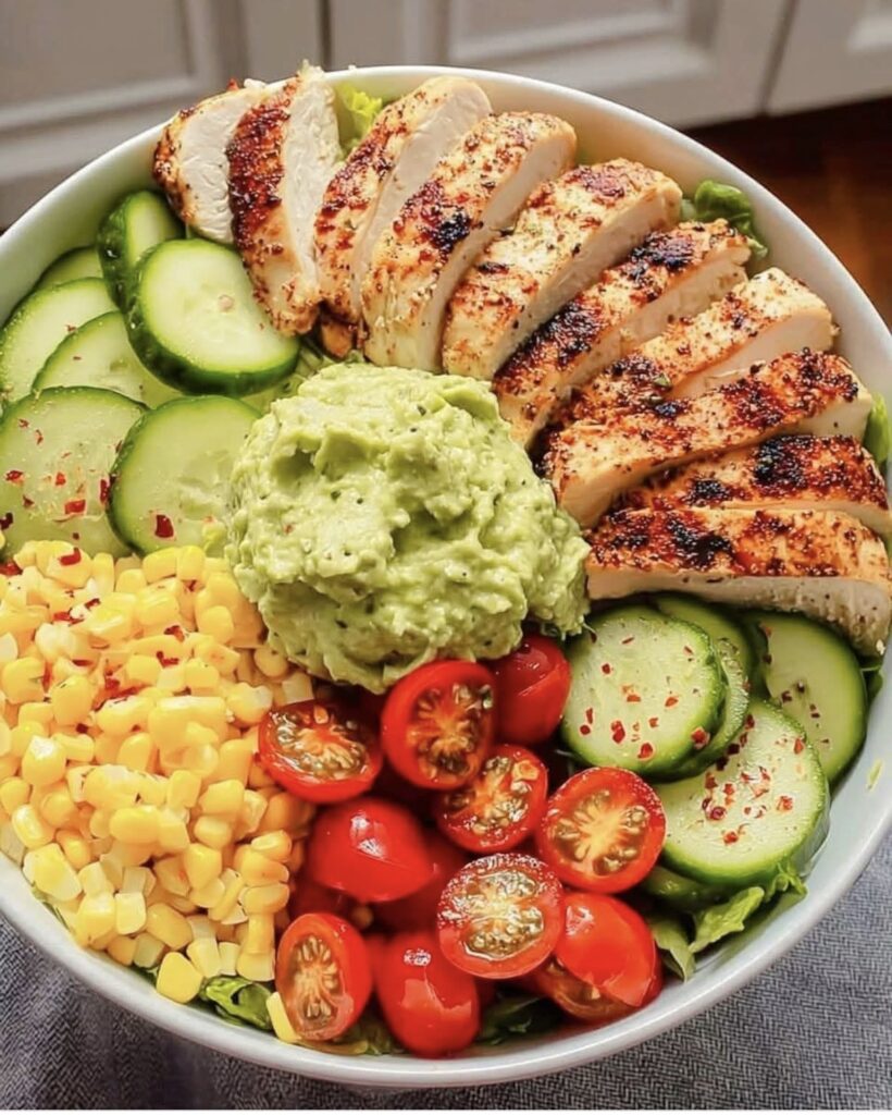 This vibrant salad bowl brings together smoky grilled chicken, creamy guacamole, sweet corn, and crisp vegetables for a meal that’s fresh, filling, and full of contrast. It’s perfect for lunch or a light dinner—balanced, colorful, and bursting with flavor.