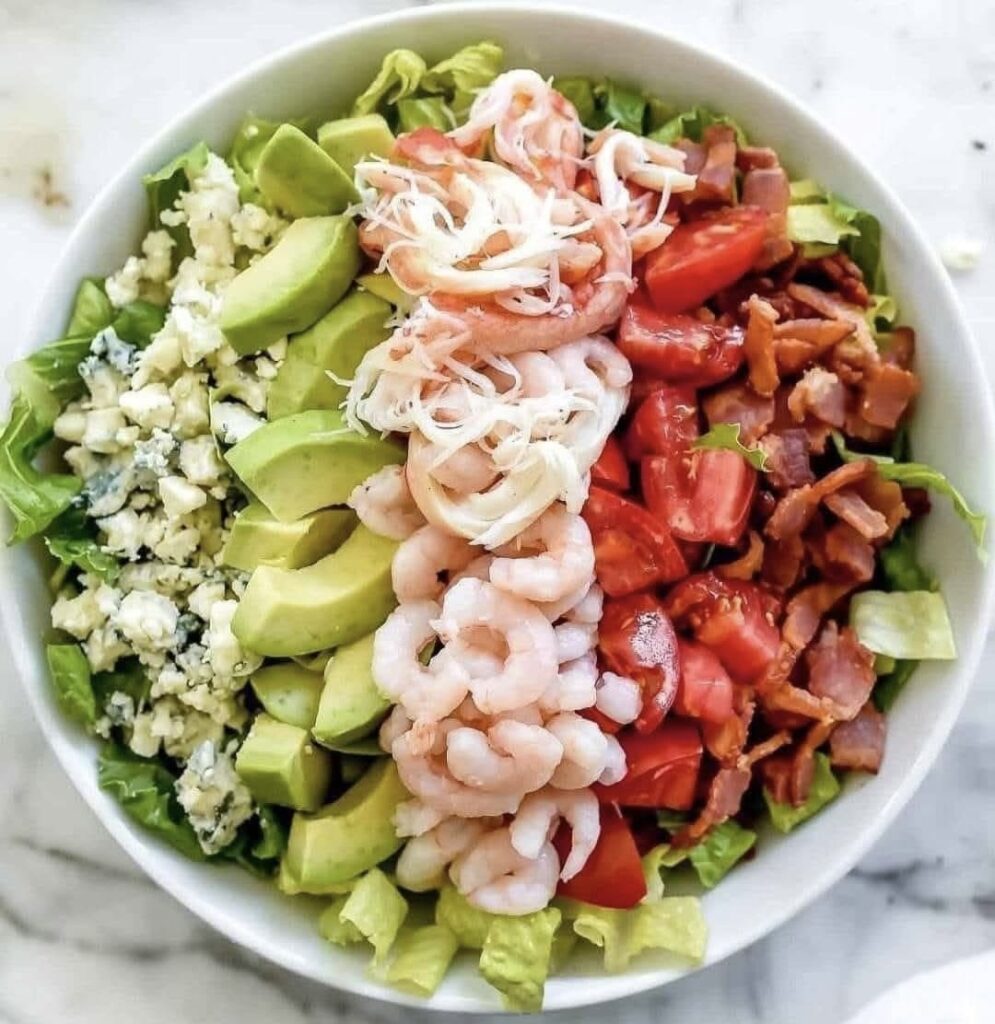 5.Arrange the bird, tomatoes, corn, cucumber, purple onion, bacon, blue cheese and avocado on top of the lettuce. Drizzle the relaxation of the dressing over the top, then serve right away. Enjoy!