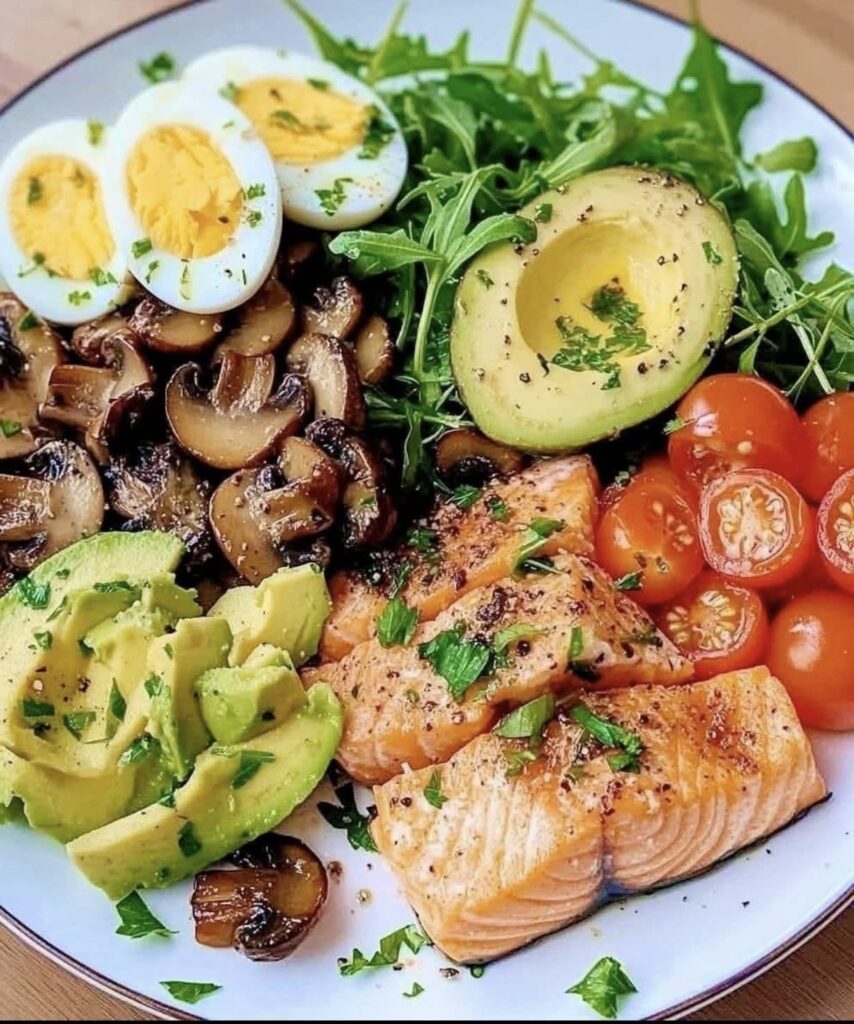 Arrange salmon, mushrooms, avocado, eggs (halved), cherry tomatoes, and fresh greens on a plate. Sprinkle with chili flakes or herbs if using.